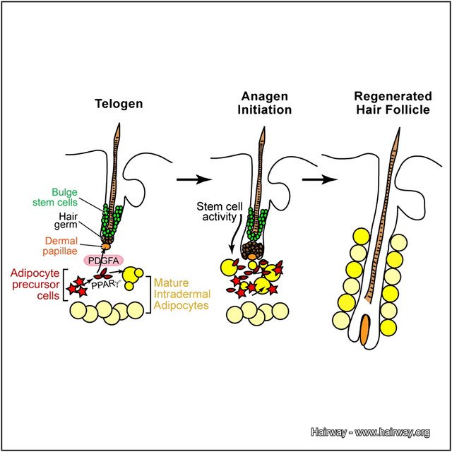 Valerie Horsley的研究小組發現,當頭髮開始生長,脂肪層擴展進程中的被稱為脂肪形成。不過毛髮萎縮死亡後,頭皮的脂肪層厚度縮小。研究人員發現,一種類型的脂肪幹細胞- 脂肪前驅細胞(adipose precursor cells)- 是讓實驗鼠毛髮再生的關鍵。他們還發現這些細胞產生的分子,稱為 PDGF((platelet derived growth factors血小板衍生生長因子),這也是毛髮生長所必須的。