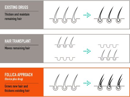 * 首先,使用能促進毛囊生長的專利裝置,接著以藥用化合物來維持並強化新生毛囊。